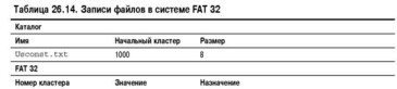 В FAT 32 количество кластеров лежит в диапазоне 00000000h-FFFFFFFFh, или 0— 4 294 967 295. Как и в FAT 16 верхние и нижние кластеры зарезервированы для специальных целей и их номера лежат в диапазоне 00000002h-FFFFFFF6h, или 2-4 294 967 286. Таким образом, для хранения файлов можно использовать 4 294 967 284 кластера. Накопитель на жестких дисках разбит на большее количество кластеров, каждый из которых становится меньше, что снижает потери дискового пространства. Пример записей о файле в FAT 32 приведен в табл. 14.