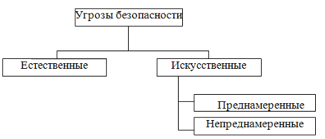 Известно большое количество разноплановых угроз безопасности информации различного происхождения. В литературе встречается множество разнообразных классификаций, где в качестве критериев деления используются виды порождаемых опасностей, степень злого умысла, источники появления угроз и т.д. Одна из самых простых классификаций приведена на рис. 1.
