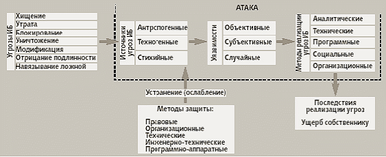 Анализ негативных последствий реализации угроз предполагает обязательную идентификацию возможных источников угроз, уязвимостей, способствующих их проявлению и методов реализации. И тогда цепочка вырастает в схему, представленную на рис. 2.