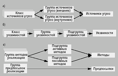 Все источники угроз можно разделить на классы, обусловленные типом носителя, а классы на группы по местоположению (рис. 3а). Уязвимости также можно разделить на классы по принадлежности к источнику уязвимостей, а классы на группы и подгруппы по проявлениям (рис. 3б). Методы реализации можно разделить на группы по способам реализации (рис. 3в). При этом необходимо учитывать, что само понятие «метод», применимо только при рассмотрении реализации угроз антропогенными источниками. Для техногенных и стихийных источников это понятие трансформируется в понятие «предпосылка».
