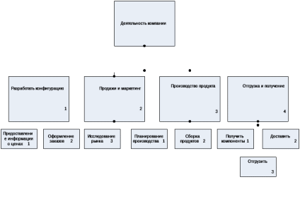 Каждый узел в диаграмме соответствует отдельному фрагменту описания диаграммы. Модель представляет собой совокупность иерархически выстроенных диаграмм, каждая из которых является описанием какой-либо функции или работы (activity).