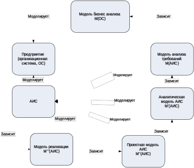 АИС в свою очередь представляет собой модель организационной системы М’ (ОС), замыкая цикл моделирования. Для того, чтобы прояснить связь между этими процессами, необходимо заметить, что создаваемая АИС также является моделью, по отношении к ОС. Таким образом, создавая документ АТ, мы тем самым порождаем как бы «модель второго порядка», т. к. документ АТ является ничем иным, как моделью модели ОС. Не обладая моделью АПО, мы, конечно, можем создать модель АТ. Но при этом мы рискуем тем, что при синтезе оригинала модели (т.е. АИС), не обладая знаниями об ОС, мы можем попасть в ситуацию рассогласования: результирующая АИС не будет ингерентна (согласована с) ОС и, тем самым, не станет жизнеспособной.