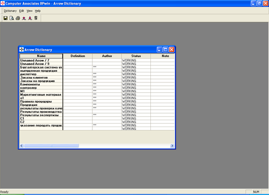 Словарь стрелок решает очень важную задачу. Содержимое словаря стрелок можно распечатать в виде отчета (меню Tools/Reports/Arrow Report) и получить тем самым толковый словарь терминов предметной области, использующихся в модели.
