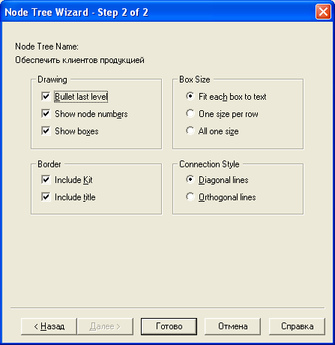 Возникает эксперт создания диаграммы дерева узлов Node Tree Wizard. В первом диалоге эксперта необходимо внести имя диаграммы дерева узлов, узел верхнего уровня и глубину дерева – Number of Levels (по умолчанию 3). Поскольку дерево узлов не обязательно в качестве верхнего уровня должна иметь контекстную работу и иметь произвольную глубину.