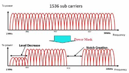 - малая мощность PLC сигнала (100 мВт) небольшими порциями распределена по широкому спектру, в то время как большая мощность КВ радиостанций (1 … 50 Вт) сконцентрирована в узком спектре;