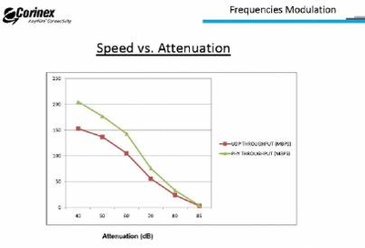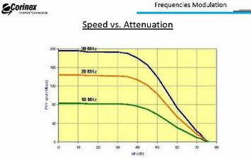 Два первых вопроса, которые задает любой потенциальный пользователь оборудования PLC это: «Какая максимальная скорость?» и «Какое максимальное расстояние?» Мгновенная физическая скорость линии может достигать 220 Мбит. Скорость, которую выдает «эстиматор», чуть ниже. При установлении соединения может пройти несколько минут, прежде чем модем определит оптимальную скорость передачи данных. Взаимосвязь между физической скоростью затуханием и полосой можно увидеть на графике (Рис. 1.11.).