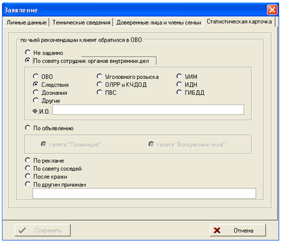 2.3) При переходе на вкладку статистическая карточка. Открывается форма, содержащая информацию о том почему обратились в ОВО и как узнали о данной организации.