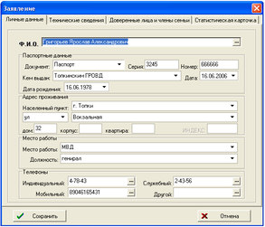 2) При нажатии на кнопку создать новое заявление открывается форма по заключению договоров об охране личного имущества граждан содержащею личную информацию о человеке заключающим договор с ОВО.