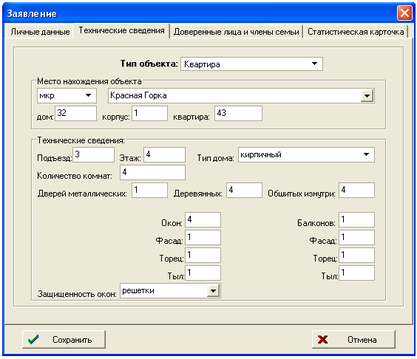 2.1) При переходе на вкладку технические сведения. Открывается форма содержащая информацию об объекте который ставится под охрану. Его технические характеристики тип объекта, из какого материала сделан объект и. т.д.