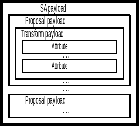 SA payload содержит внутри себя список Proposal payload-ов, каждый из которых представляет собой отдельный протокол. Proposal payload-ы могут объединяться в группы по «И» и по «ИЛИ». Это осуществляется с помощью номеров данных компонент – одинаковые номера означают объединение по «И», а разные по ИЛИ. В свою очередь Proposal payload содержит список Transform payload-ов, которые представляют алгоритмы для данного протокола. Объединены они могут быть только по «ИЛИ». Transform payload содержит список атрибутов, конкретизирующих данный алгоритм (длина ключа) и содержащих другие параметры соединения. Атрибуты не могут выбираться, или принимается весь список атрибутов или все отвергает.