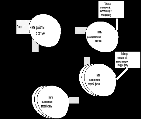 На рисунке окружностями условно показаны нити, одинарными стрелками передача данными между нитями, а двойными взаимодействие с таблицей (добавление, поиск и удаление). Программа содержит 4 вида нитей: