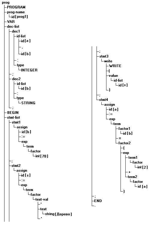 Сначала производится анализ, какие терминальные символы входят в грамматику: ”PROGRAM”, ”VAR”, ”BEGIN”, ”END”, ”.”, ”INTEGER”, ”;”, ”:=”, ”+”, ”-”, ”FOR”, ”DO”, ”TO”.