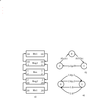 ункции fi и hi задаются диаграммой, представленной на рис. 4.2. Каждый из роботов Rbi воспринимает только одну команду «g», в результате которой он перемещается к накопителю S, захватывает деталь, переносит и устанавливает ее на конвейер Сi. Сигналы «y» и «Y» на выходе робота появляются тогда, когда он освобождает опасную зону и завершает выполнение одного цикла соответственно. Будем строить управляющую структуру в виде трех автоматов, два из которых (Reg1 и Reg2) являются логическими регуляторами роботов, а третий (Res) обеспечивает слежение за ресурсом.