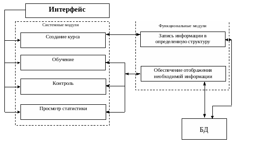 Обучающая оболочка привязана только к базе, которая может модифицироваться приложением по созданию курса. Таким образом разработанная система является универсальной для определенного типа курсов.