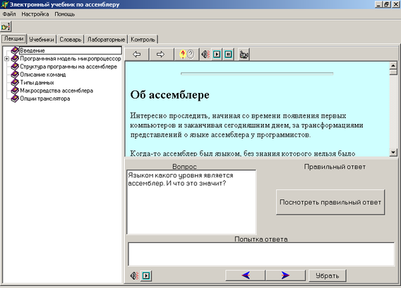 Главная формы приложения содержит ряд закладок: лекции, учебники, словарь, лабораторные, контроль. Эти закладки соответствуют структуре обучающего материала. На рисунке В.1 приложения В показана закладка лекции. Содержимое других закладок имеет аналогичную структуру. В левой части формы показываются разделы и подразделы , содержащие лекции. В правой части показывается содержимое конкретной, выбранной лекции. Существует возможность для прослушивания краткого содержания лекции, чтобы сориентироваться, нужно ее читать или нет.