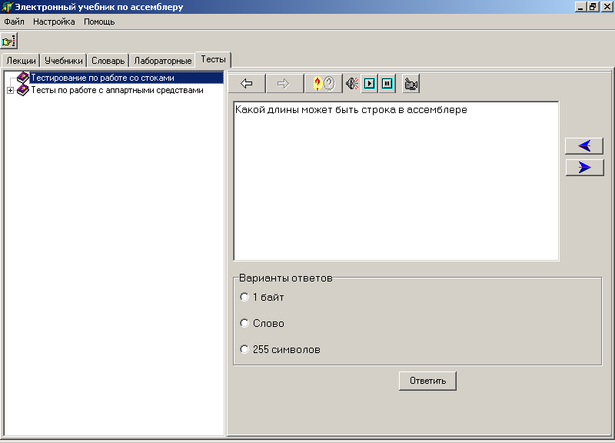Закладка “Тесты” содержит форму для прохождения тестирования по различным темам. Форма представлена на рисунке В.2 приложения В.