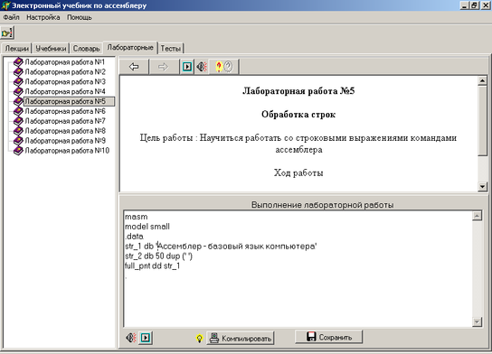 Закладка “Лабораторные” содержит лабораторны, объединеные по темам. Выбрать лабораторную нужно в левой части окна – обозначено 1 на рисунке В.3 приложения В. В правой части окна, обозначенной 2 на рисунке, показывается текст выбранной лабораторной. В правой нижней части окна, обозначенной 3 на рисунке можно выполнить лабораторную, сохранить в файл, откомпилировать.
