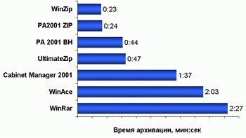 Что же, неужели заслуженный ветеран ZIP до такой степени ни на что не годен? Верится с трудом. И в этом нас убеждает второй график, на котором отображено время архивации тестового файла. Здесь ситуация повторяется с точностью до наоборот. Формат ZIP наиболее предпочтителен для самых нетерпеливых, а вот чемпионы по степени сжатия плетутся в самом конце. Причем WinRar сокрушительно, по всем статьям проиграл своему более молодому и рьяному конкуренту - WinAce. График времени распаковки архивов не приводится по причине практически равенства всех программ при выполнении этой задачи, ведь согласитесь, что 6 секунд разницы между самым быстрым и самым медленным архиваторами при распаковке 40 мегабайтного архива в реальных условиях совсем не заметны.