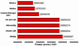 Если сравнивать размеры полученных архивов, то все результаты делятся на две группы, первая включает в себя самые "продвинутые" архиваторы WinAce, WinRar и Cab-inet Manager, для получения наибольшей степени сжатия самые современные алгоритмы, во - второй же, значительно отставая от первой, попали архиваторы, базирующие на уже устаревающем формате ZIP, и примкнувшем к ним BlacHole-е.