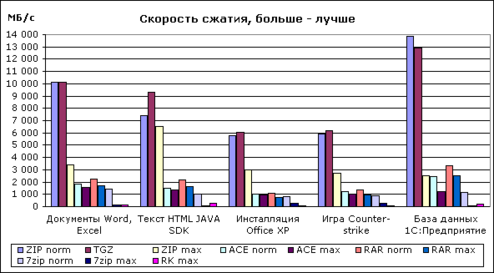 В среднем скорость: ZIP norm в 4 раза быстрее RAR norm, RAR max в 9 раз быстрее 7zip max.