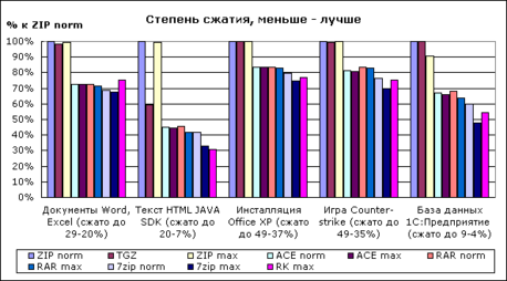 Еще я провел тестирование популярных архиваторов и мной была сжата инсталляционная программа MS Office XP, по результатам теста были составлены следующие диаграммы: