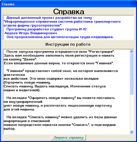 Целью дипломного проекта является разработка информационной системы диспетчера транспортного отдела фирмы грузоперевозок. Основным назначением программы является автоматизация рабочего места диспетчера транспортного отдела. При использовании данного программного продукта, исключается необходимость заполнения в ручную большего количества бумажной документации и появляется защита от несанкционированного доступа. Также это программное обеспечение позволяет производить поиск уже обращавшихся клиентов по базе данных, заносить данные о новой машине, удалять информацию из базы данных о списанных машинах, выдавать накладную, изменять статус вернувшихся из поездки машин и водителей. Данное программное обеспечение предоставляет справку по работе с программой. Программа имеет интуитивно понятный и эргономичный интерфейс, несложный при овладении навыками работы с программой, что сокращает времени обучения работы с программой.