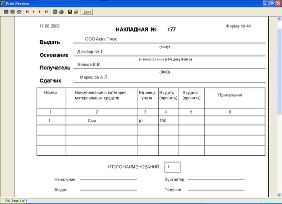 Накладная из системы формирования отчетов работнику транспортного отдела.