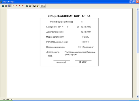 Лицензионная карточка работнику транспортного отдела из системы формирования отчетов.