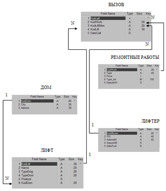 Теперь мы можем на основе даталогической модели построить физическую модель БД ИС "Вызов" в нотации СУБД Paradox.