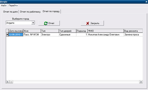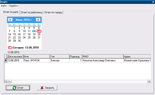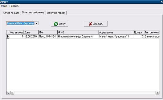В БД ИС "Вызов" есть система отчетов для удобного просмотра выполненных работ, при необходимости их можно отпечатать, передать в другие инстанции или для выставления счета заказчику. Для того что бы просмотреть отчет в форме "Вызов" нажмите в меню "Отчет", далее откроется форма "Отчет" в которой есть три вкладки: отчет по дате, отчет по работнику, отчет по городу.