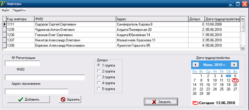Для того что бы добавить нового лифтера нам надо открыть форму "Лифтеры" нажав в главном окне кнопку "Добавить лифтера" (см. рис. 3.6).
