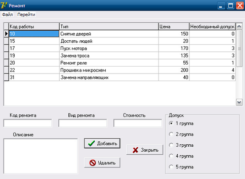 Вся необходимая информация о ремонтных работах содержится в форме "Ремонт" (см. рис. 3.6). При появлении новых видов работ, их можно добавить в базу при помощи той же формы.