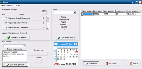 Создание новой заявки происходит с помощью формы "Вызов". Здесь необходимо выбрать номер дома, вид ремонта, лифтера, дату заявки. Если допуск лифтера не будет соответствовать типу работы то система сообщит об этом. Для удобство ввода информации поля "вид ремонта" и "лифт" выполнены с помощью элемента DBLookupComboBox. Для того чтобы не вводить каждый раз эту информацию вручную, её можно выбрать из выпадающего списка.