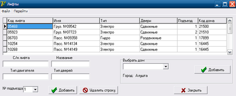 Для добавления нового лифта мы заполняем следующие поля: С/н лифта, название, тип двигателя, тип дверей, номер подъезда и дом. Для удобства ввода данных поля "номер подъезда" и "Дом" выполнены с помощью элемента DBLookupComboBox. Для того чтобы не вводить каждый раз эту информацию вручную, её можно выбрать из выпадающего списка. Эта форма очень удобно для добавления новых лифтов которое предприятие будет обслуживать в будущем.
