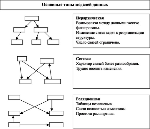 В настоящее время для баз структурированных данных различают три основных типа логических моделей данных в зависимости от характера поддерживаемых ими связей между элементами данных - сетевую, иерархическую и реляционную. Классифицирующими признаками в этих моделях являются: степень жесткости (фиксации) связи, математическое представление структуры модели и допустимые типы данных (см. таблицу 1.1).