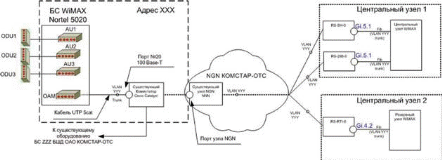 Рисунок 24 - Типовая схема включения БС WiMAX, размещенных на существующих площадках БШД с использованием транспортных каналов NGN