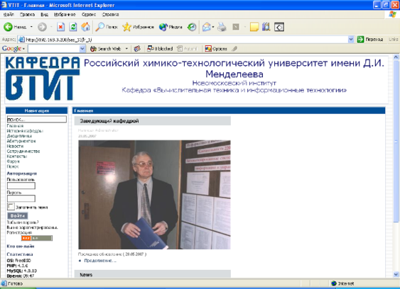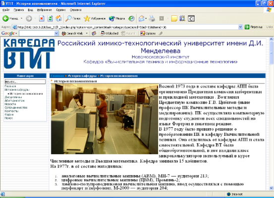 При нажатии на ссылке «История кафедры» выводится информация о возникновении последней, информация о дисциплинах и ссылки на их краткое описание (рисунок 4).