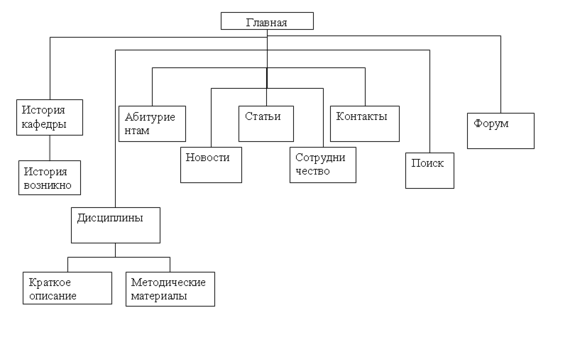 В соответствии с разработанной структурой была спроектирована главная страничка сайта (Рисунок 3). Она содержит все основные структурные элементы, переход по которым осуществляется с помощью гиперссылок.