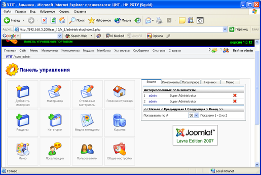 Разработка web-сайта велась в основном в паке компании Joomla 1.0.12. Выбор данного пакета обоснован тем, что его освоение отнимает мало времени, во время разработки доступен предварительный просмотр каждой отдельно сделанной операции, доступно большое количество функций (организация интерактивных элементов сайта, создание гиперссылок в несколько кликов мышки и т.п.), пакет поддерживает большое количество технологий (HTML, PHP, ASP, Java, XML, XSLT, CSS и другие).
