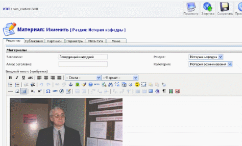 В поле "Описание" используется специальный редактор HTML, то есть не Joomla, а ее расширение - мамбот. Данное расширение, мамбот, называется HTML-редактором Joomla. В системе можно использовать любой из множества различных визуальных HTML-редакторов, но рекомендуется использовать "TinyMCE" (Рисунок 12).