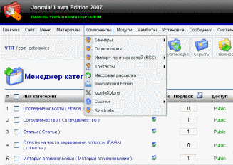 Первый способ: можно нажать на главной странице панели кнопку "Управление категориями", или в основном меню выберите "Содержимое", затем пункт "Управление разделами". Будет открыта страница "Управление категориями".