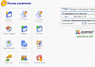 При правильном вводе имени пользователя и пароля откроется главная страница администрирования системой, то есть будет открыта панель управления Joomla (Рисунок 9), которая предоставит управления всеми функциями и возможностями Joomla. Возвратиться на главную страницу панели можно в любое время при нажатии кнопки "Главная" в левом верхнем углу.