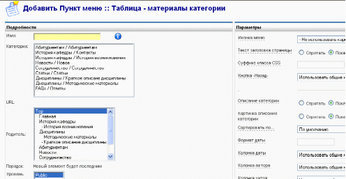 Справа, после сохранения, доступны дополнительные параметры управления объектом содержимого. Последняя вкладка "Связь с меню" может настраиваться при создании меню.