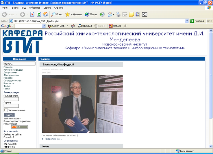 Разработанный сайт удовлетворяет всем требованиям, поставленным на этапе постановки задачи. При разработке web-сайта были использованы готовые модули аутентификации, форума и осуществления поиска по сайту. Данные модули были доработаны с учетом специфики web-сайта и успешно внедрены в его структуру.