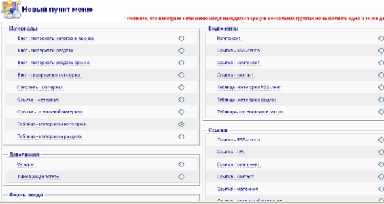 На странице "Новый пункт меню" (Рисунок 18) доступно несколько типов создаваемого пункта меню. Все типы разбиты по группам.