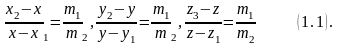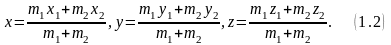 Введем понятие центра масс системы тел. В элементарной физике вводится понятие центра тяжести как точки приложения равнодействующей сил тяжести, действующих на элементы тел. Введем более общее понятие, не зависящее от силы тяжести центр масс системы. Центром масс двух материальных точек называется точка, делящая расстояние между ними в отношении, обратно пропорциональном их массам (рис. 1.). усть имеем две материальные точки массой m1 и m2, координаты которых в неподвижной системе отсчета соответственно x1, y1, z1 и x2, y2, z2. По известному правилу аналитической геометрии координаты точки x, y, z, делящей отрезок в заданном отношении