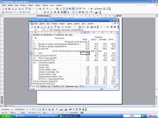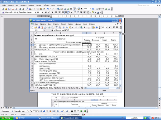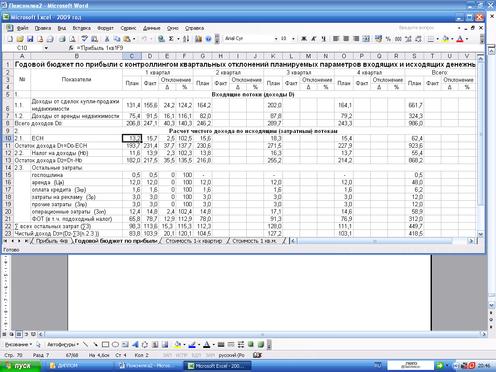 Табл. 23. Годовой бюджет по прибыли с контроллингом квартальных отклонений планируемых параметров входящих и исходящих денежных потоков на 2009г, тыс. руб.