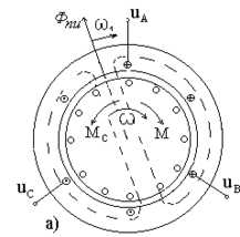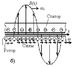 При протекании трёхфазной системы токов по трёхфазной обмотке статора в двигателе создаётся магнитное поле с индукцией В(х), распределённой вдоль окружности воздушного зазора между статором и ротором по синусоидальному закону и вращающееся в направлении чередования фаз с угловой скоростью 1 (рисунок 2.1)