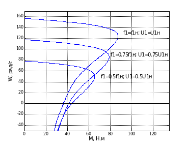 При регулировании скорости желательно сохранять перегрузочную способность, для этого необходимо одновременно и пропорционально изменять частоту и ЭДС обмотки статора или питающее напряжение U1, так как оно мало отличается от ЭДС. Этот способ позволяет обеспечить широкий диапазон плавного и экономичного регулирования скорости. Механические характеристики при этом способе регулирования скорости представлены на рисунке 2.9.