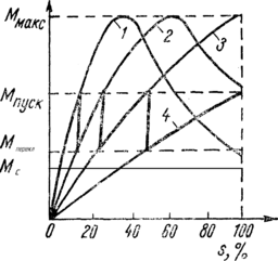 На рисунке 2.7, б изображены кривые зависимости вращающего момента от скольжения при различных значениях пусковых сопротивлений в процессе пуска асинхронных двигателей с фазным ротором.